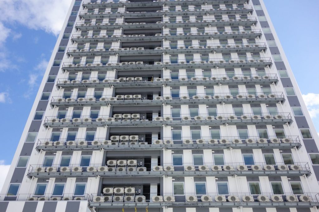 途中、こんなエアコン室外機だらけのビルを見たりしつつ